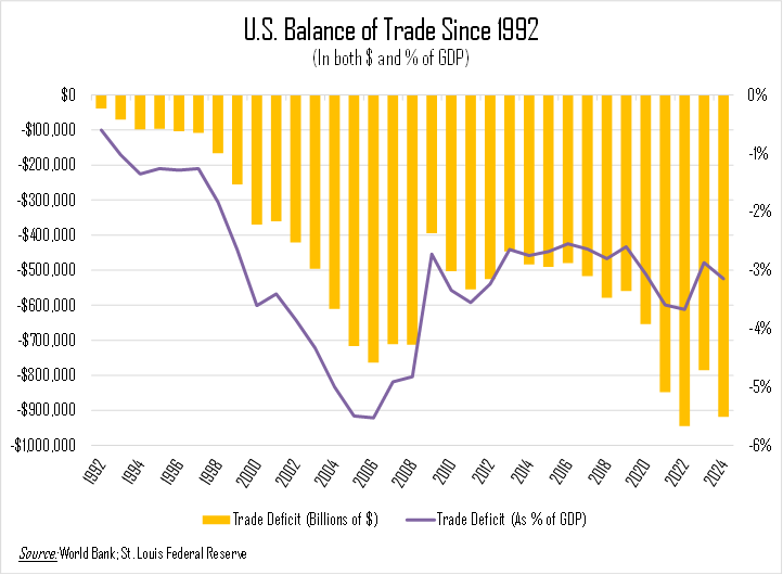 To unpack all of these justifications would take more space than we have available in this format. However, we can attempt to address a few high points. First, on fairness, there is clearly some room for improvement. The U.S. trade deficit has consistently expanded over the last three decades, and currently stands at a level of about $1 trillion per year (meaning that we import substantially more goods from other nations than they purchase from us). As a percentage of our total economy, that figure has actually tightened somewhat in recent years—at its “worst” level, in 2005, the deficit represented more than 5.5% of U.S. GDP, but that level has stabilized at an average of 3% per year over the last 10. Still, that’s a wide gap, and by some estimates, more than 85% of our trading partners have “advantageous” trade deals with the U.S. Some amount of leveling is easy to justify, but any attempt to eliminate the trade deficit entirely is undesirable and likely impossible. The U.S. runs consistent trade deficits in large part because we are the world’s largest consumer economy, and our residents buy incredible amounts of products of all types, many of which do not (or cannot) exist inside our borders. Take, for example, the tiny nation of Lesotho, which is subject to one of the highest reciprocal tariff rates under the Trump plan, at 50%. With a per-capita GDP of just $1,000, Lesotho’s consumers cannot afford much in the way of imports from the U.S., and they therefore purchase practically nothing. But their economy relies heavily on the production and trade of diamonds and denim (roughly 10% of its national economy), and the U.S. imports nearly $240 million of goods from the nation each year. Essentially all of this amount represents a trade deficit, and under the new tariff calculations, this deficit qualifies Lesotho as an abusive trade partner, subject to a 50% “reciprocal” tariff.